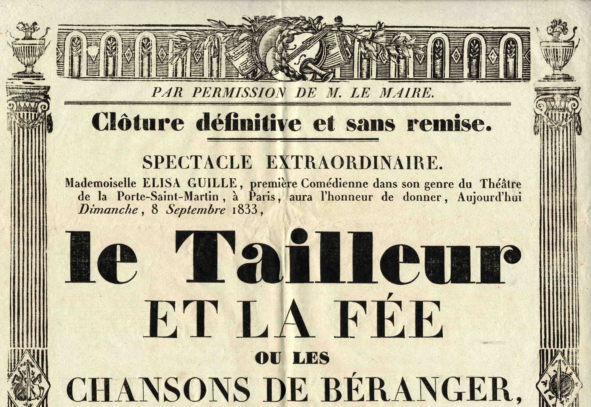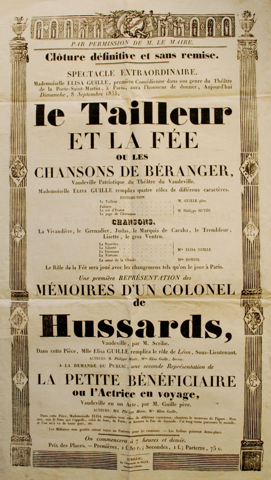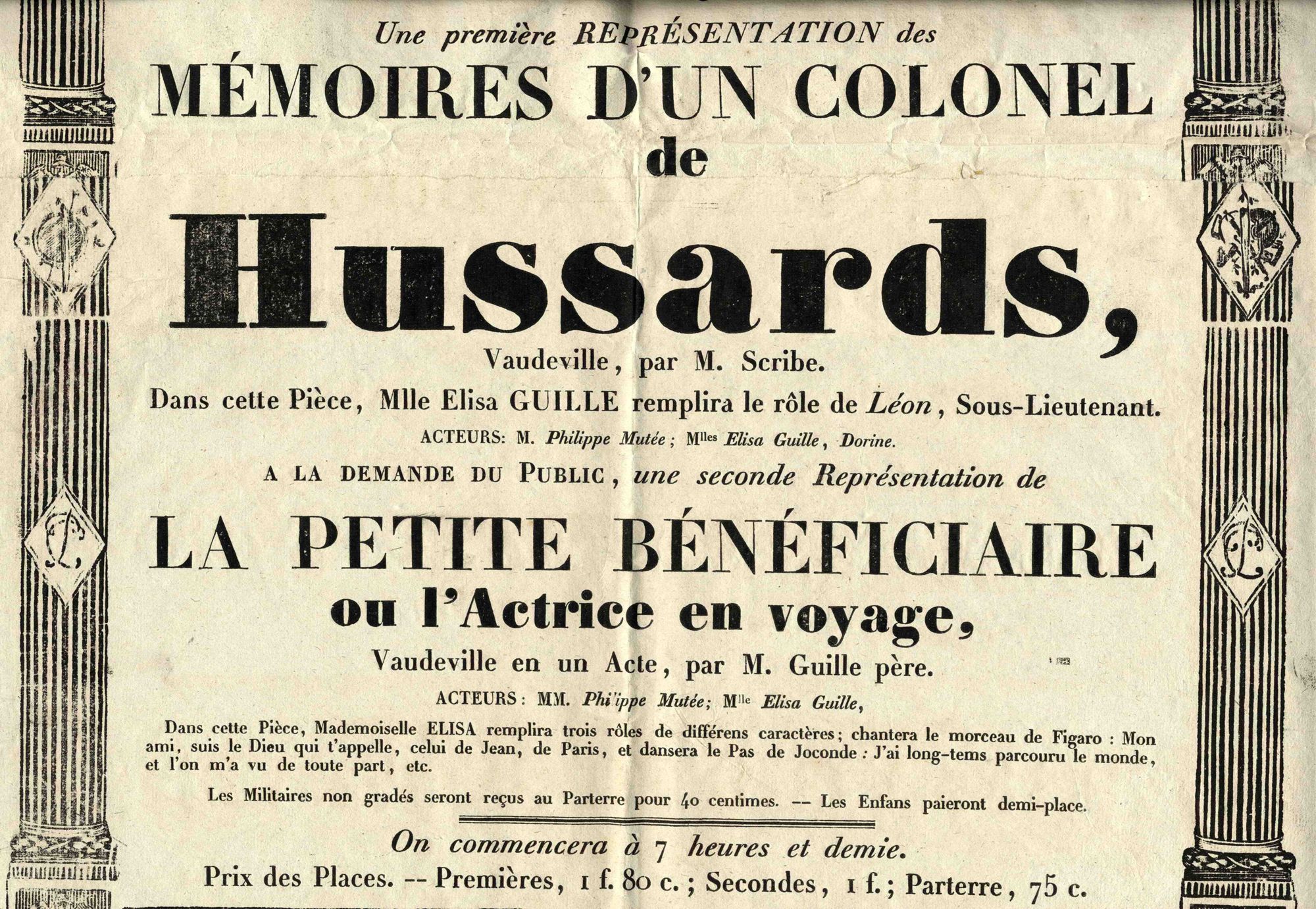 « Mademoiselle Elisa Guille, première comédienne dans son genre du Théâtre de la Porte-Saint-Martin », sera la reine de la séance, jouant plusieurs rôles dans les trois pièces au programme.