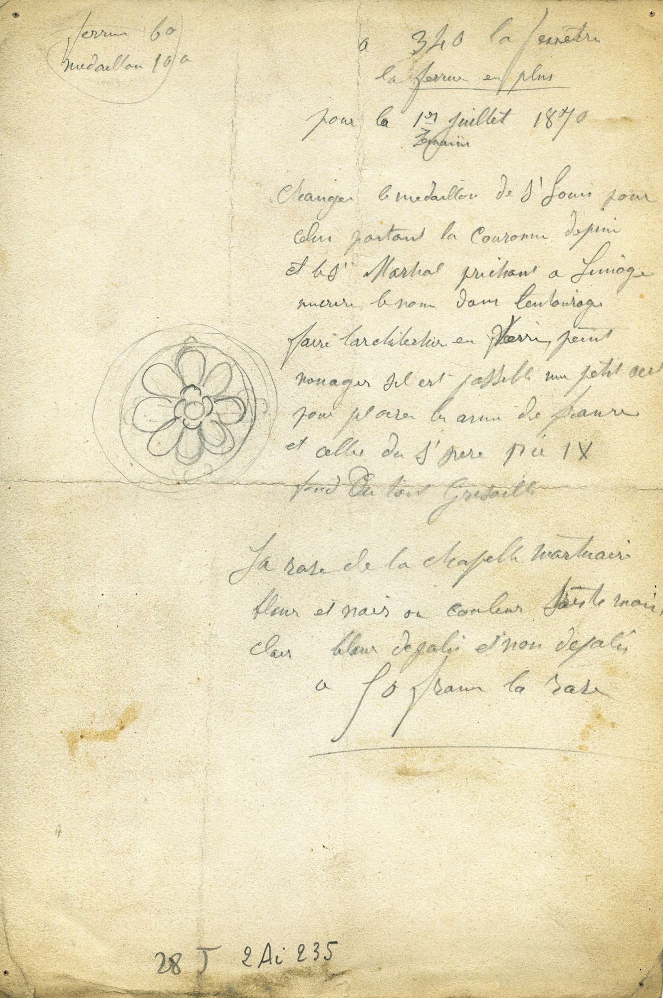 Ce dessin au crayon et à l’encre, non signé, esquisse un vitrail « ogival » destiné au chœur et composé de deux lancettes, dont chacune comporte un médaillon ovale figuratif.