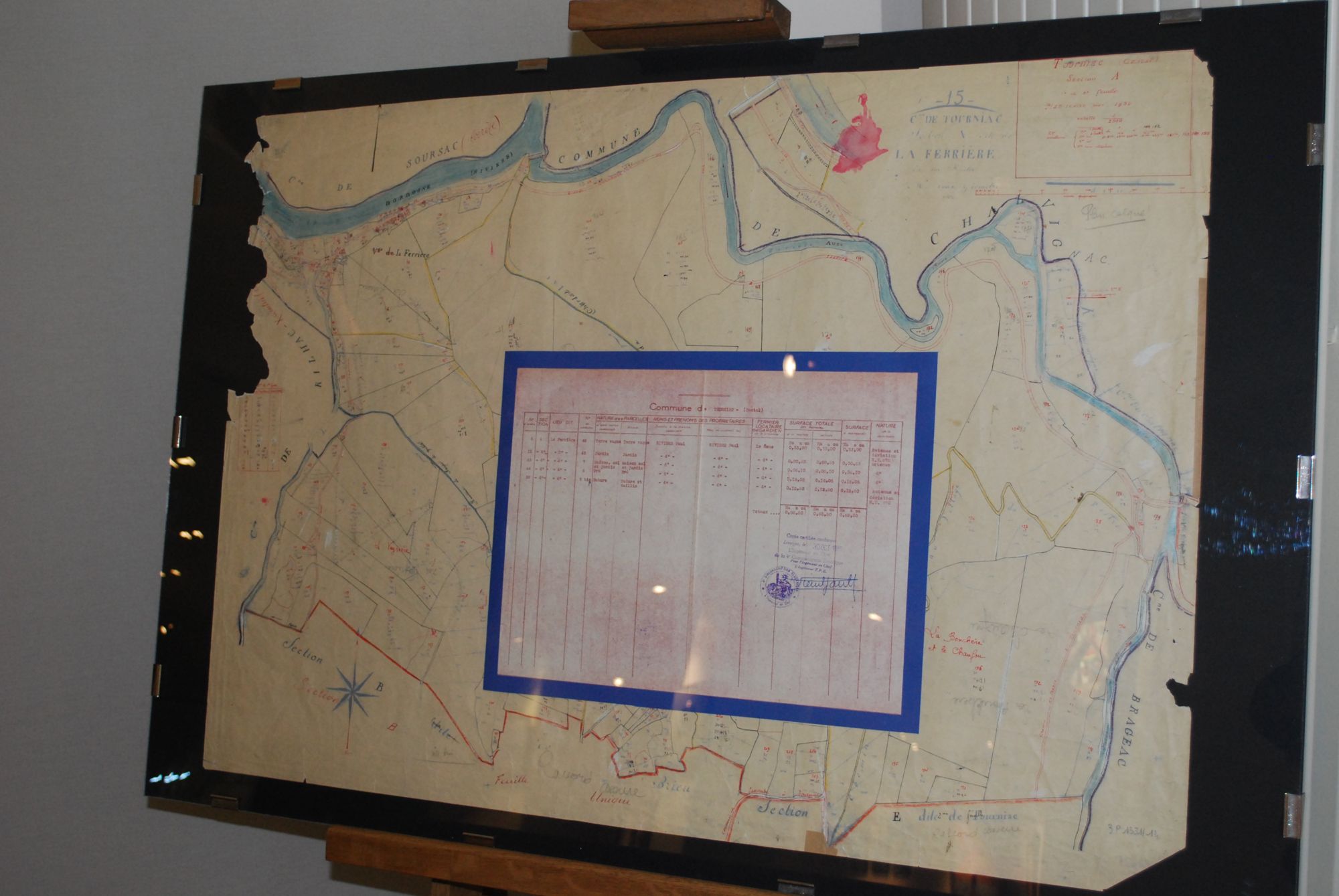 Le cadastre de 1822 est reproduit en stencil (d’où cette couleur bleue), et la rénovation est portée à l’encre rouge.