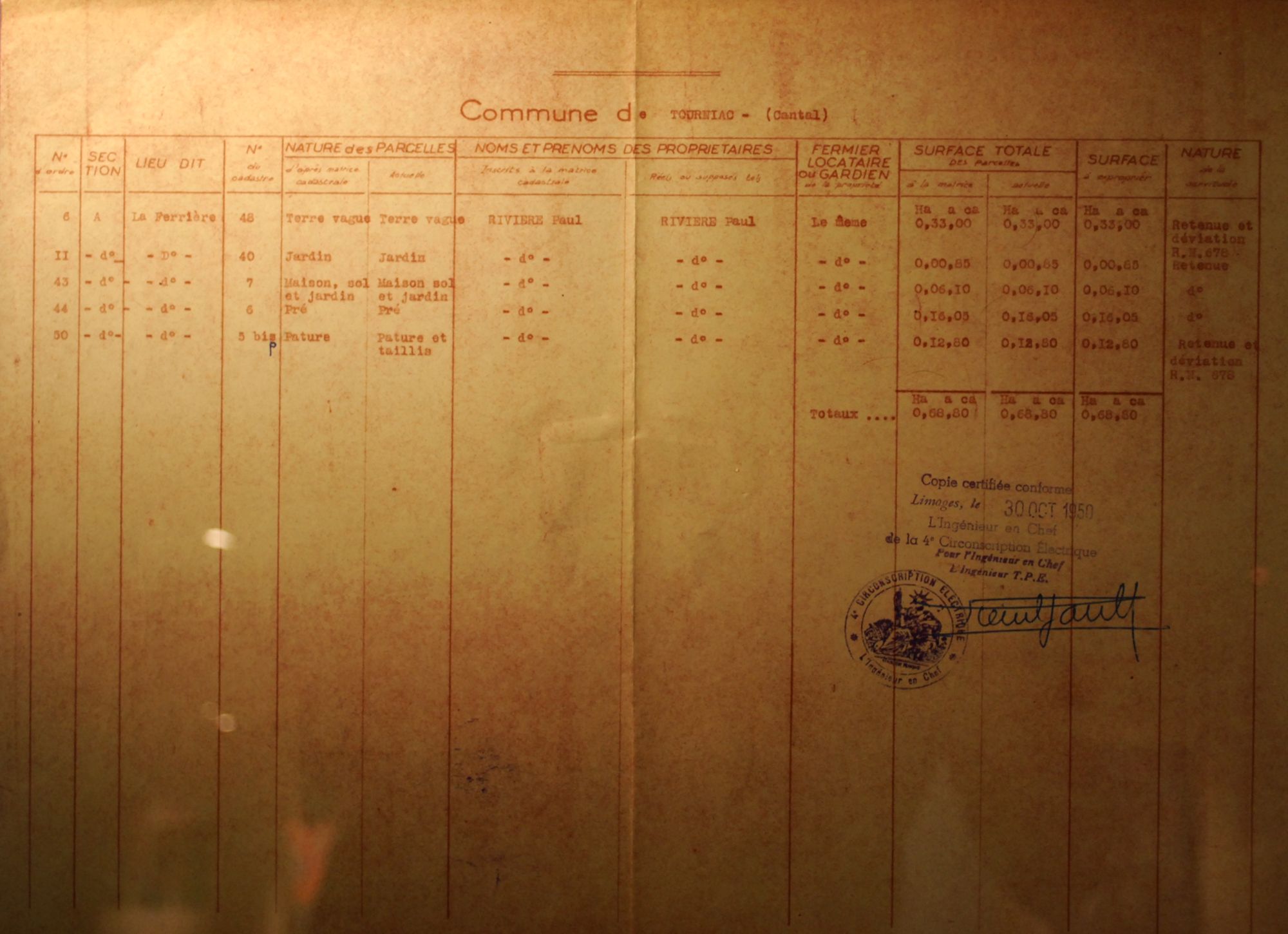 « Bleu » pour la révision du cadastre de Tourniac, section A dite de la Ferrière (1934).