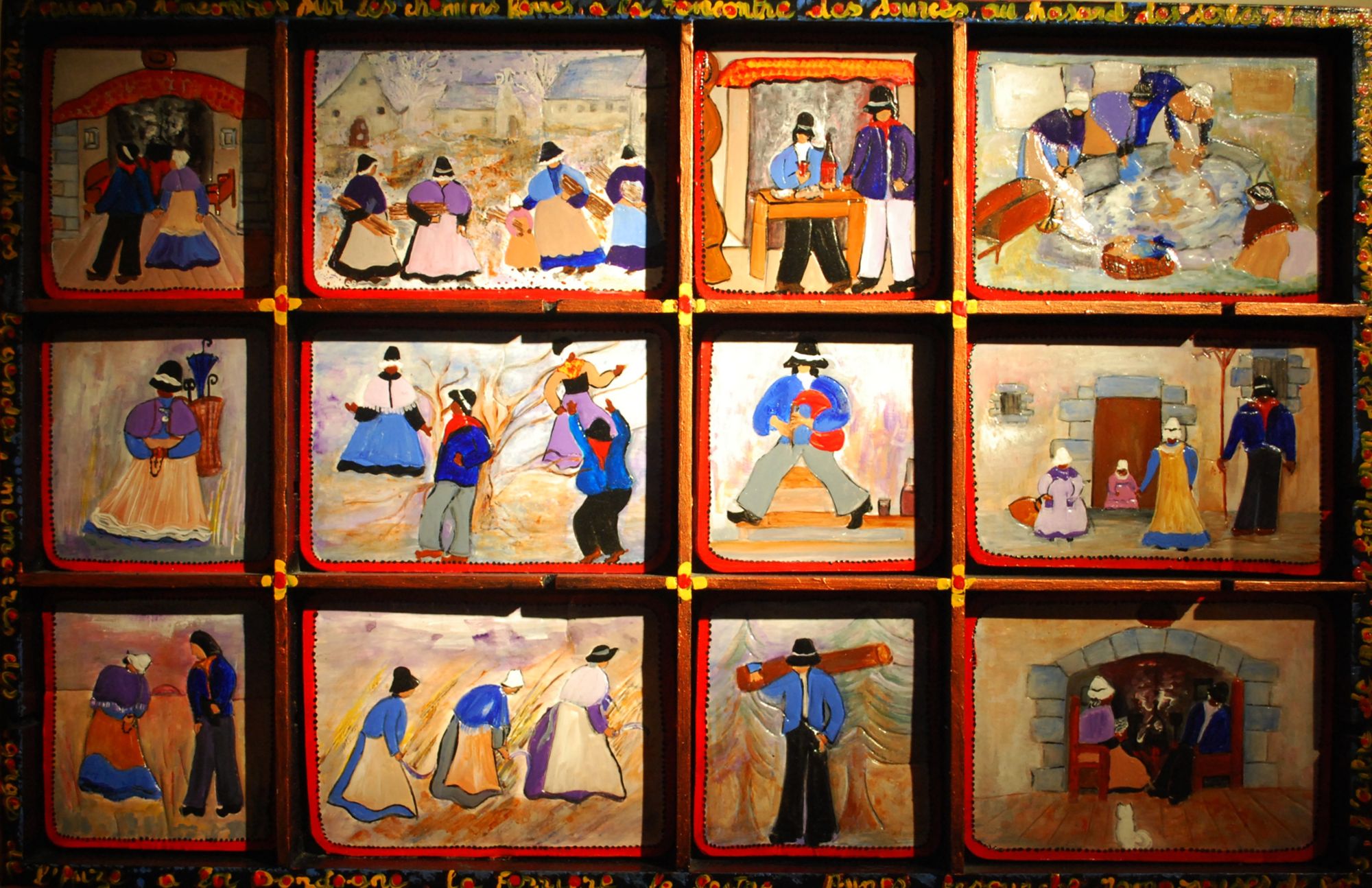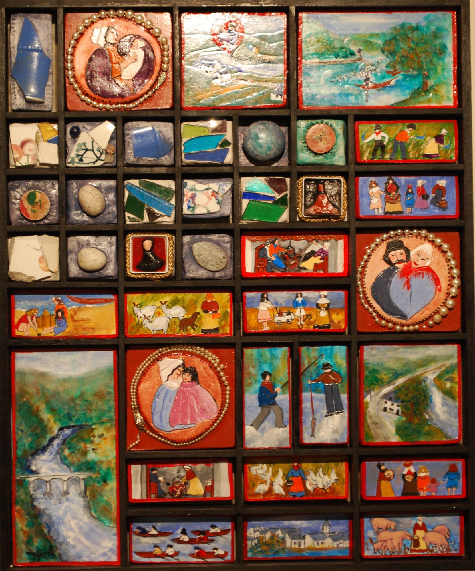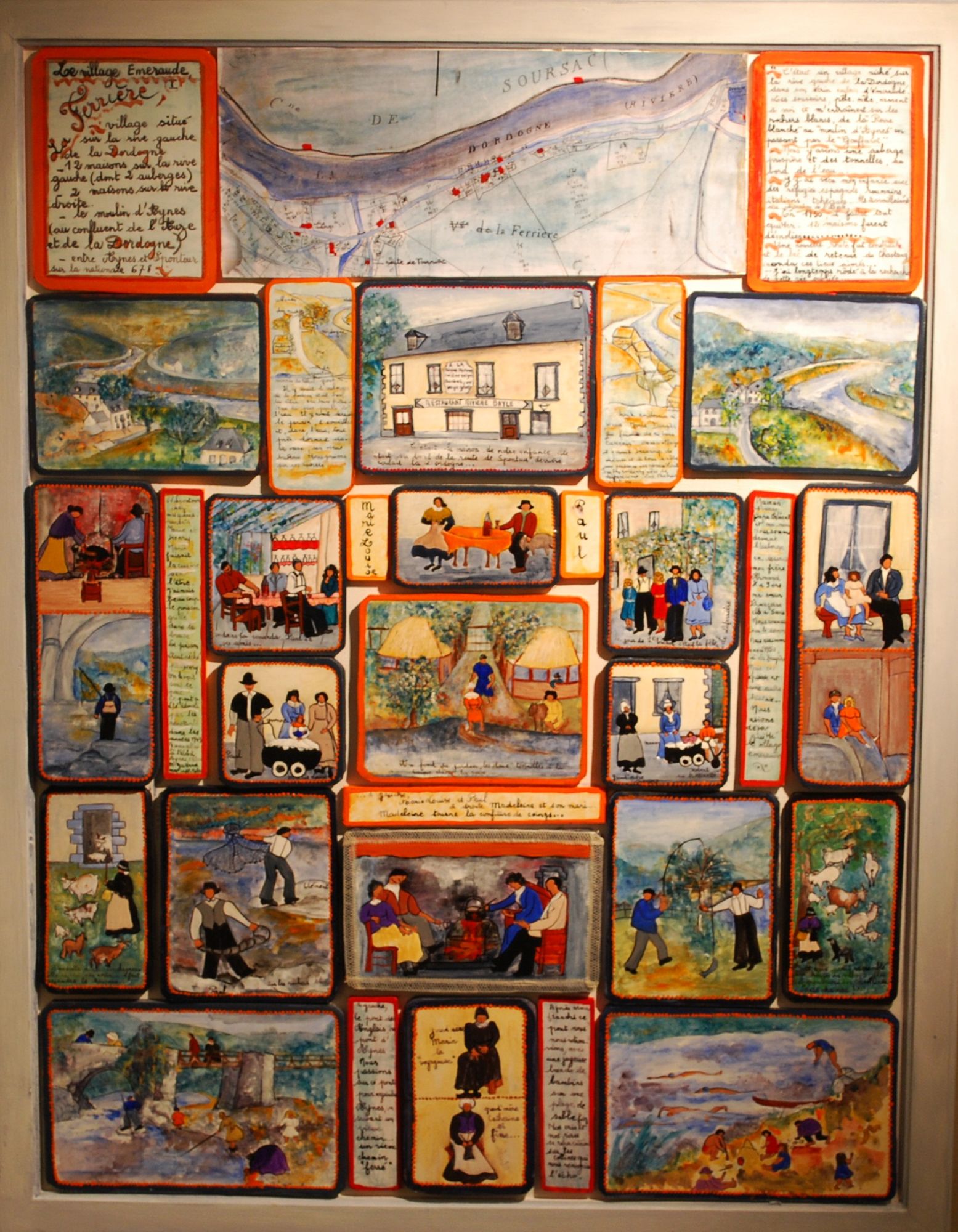 Dans chacune des logettes ménagées dans le casier de l’imprimeur prennent place des tableautins décrivant, en couleurs lumineuses, des scènes de la vie dans la vallée avant l’engloutissement de 1951 : baignades, canotage, entretien des bêtes, fauchage à la serpette, fêtes et pêches. Comme autant de pièces de puzzle, comme autant de vignettes de bandes dessinées, qui racontent et reconstituent une enfance.