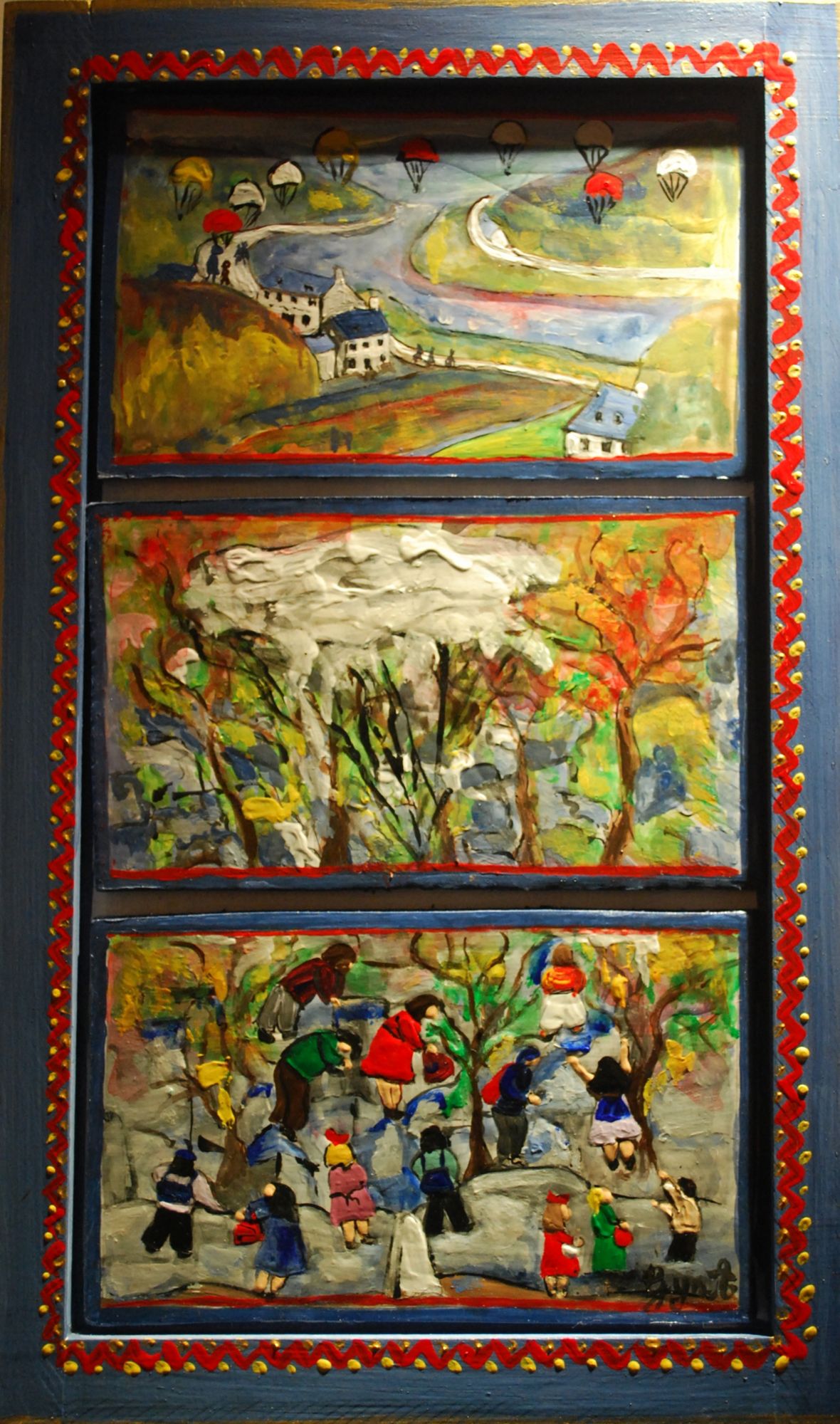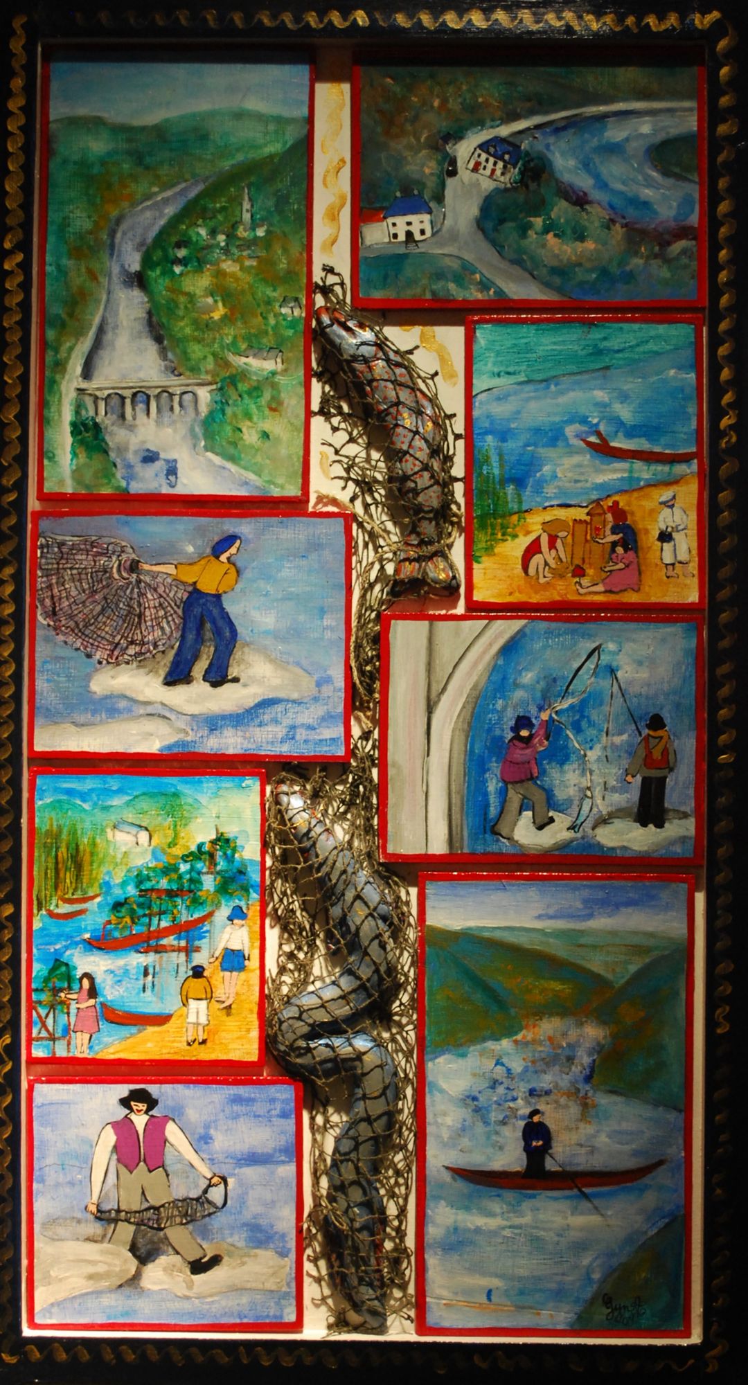 Pour autant, Ginette Aubert, désormais Mauriacoise, n’est point femme à laisser lessiver ou suffoquer sa mémoire. Non seulement elle écrit, mais elle peint, depuis toujours, ses souvenirs de la « vallée émeraude », devenue vallée de larmes. Et l’exposition est avant tout un chatoiement de couleurs vives, sous le pinceau tour à tour naïf, brut ou chagallien de celle qui fut la « petite fille » de la « rivière », devenue femme, comme en témoigne sa signature « GynA ».