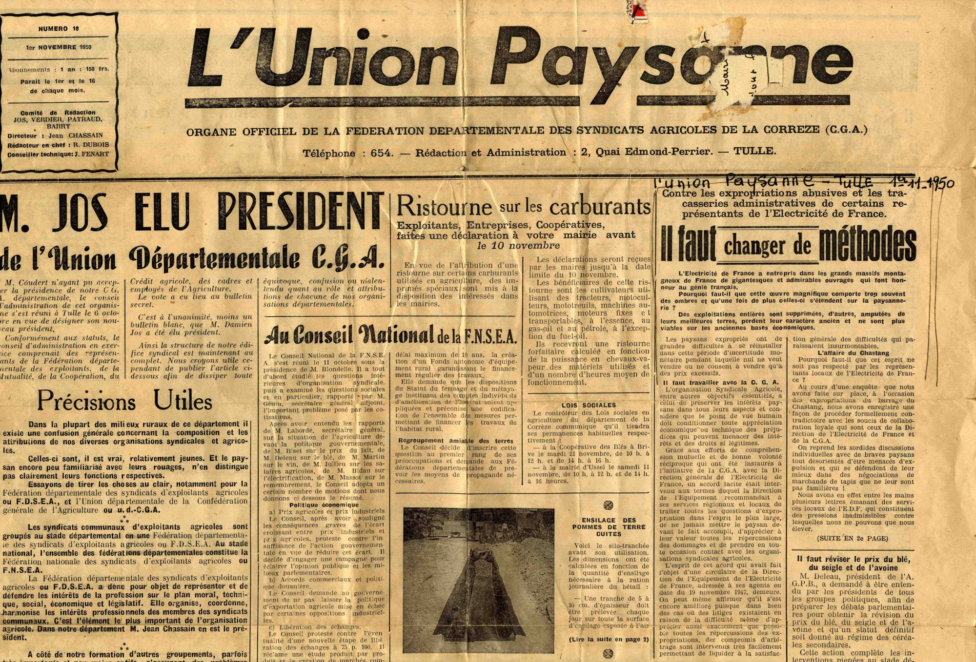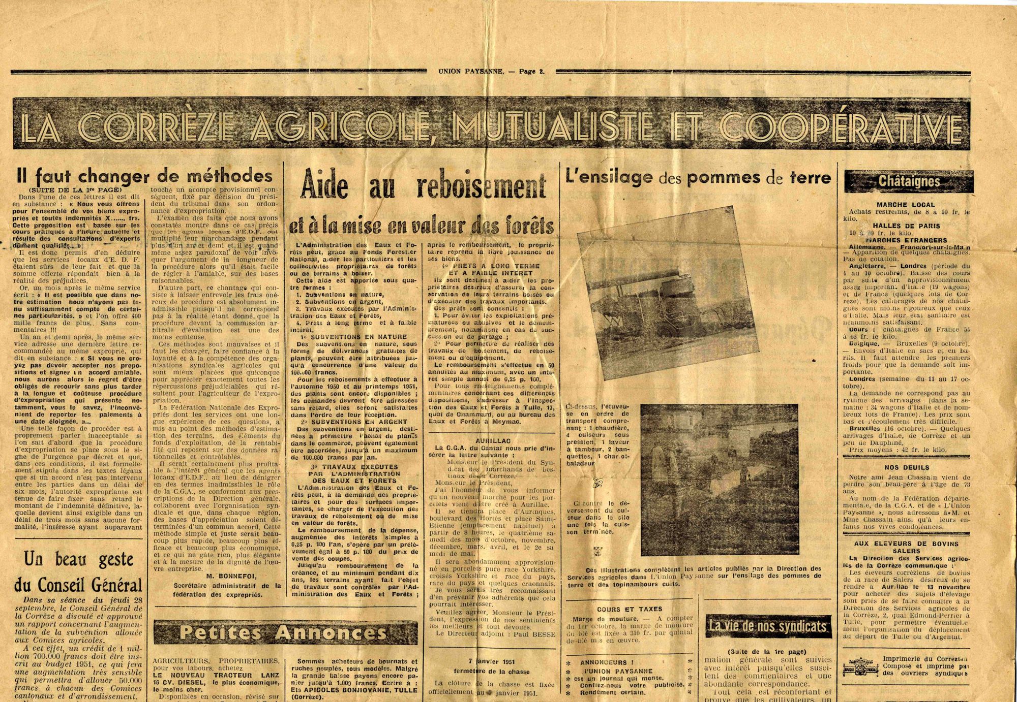 « Il faut changer de méthodes », dit cet article de Marius Vazeilles (forestier, archéologue et communiste, grand défenseur des paysans) paru le 1er novembre 1950 dans « l’organe officiel de la fédération départementale des syndicats agricoles de la Corrèze ». Et le journal de dénoncer les « pressions inadmissibles » exercées sur de « braves paysans tout désorientés d’être menacés d’expulsion ».