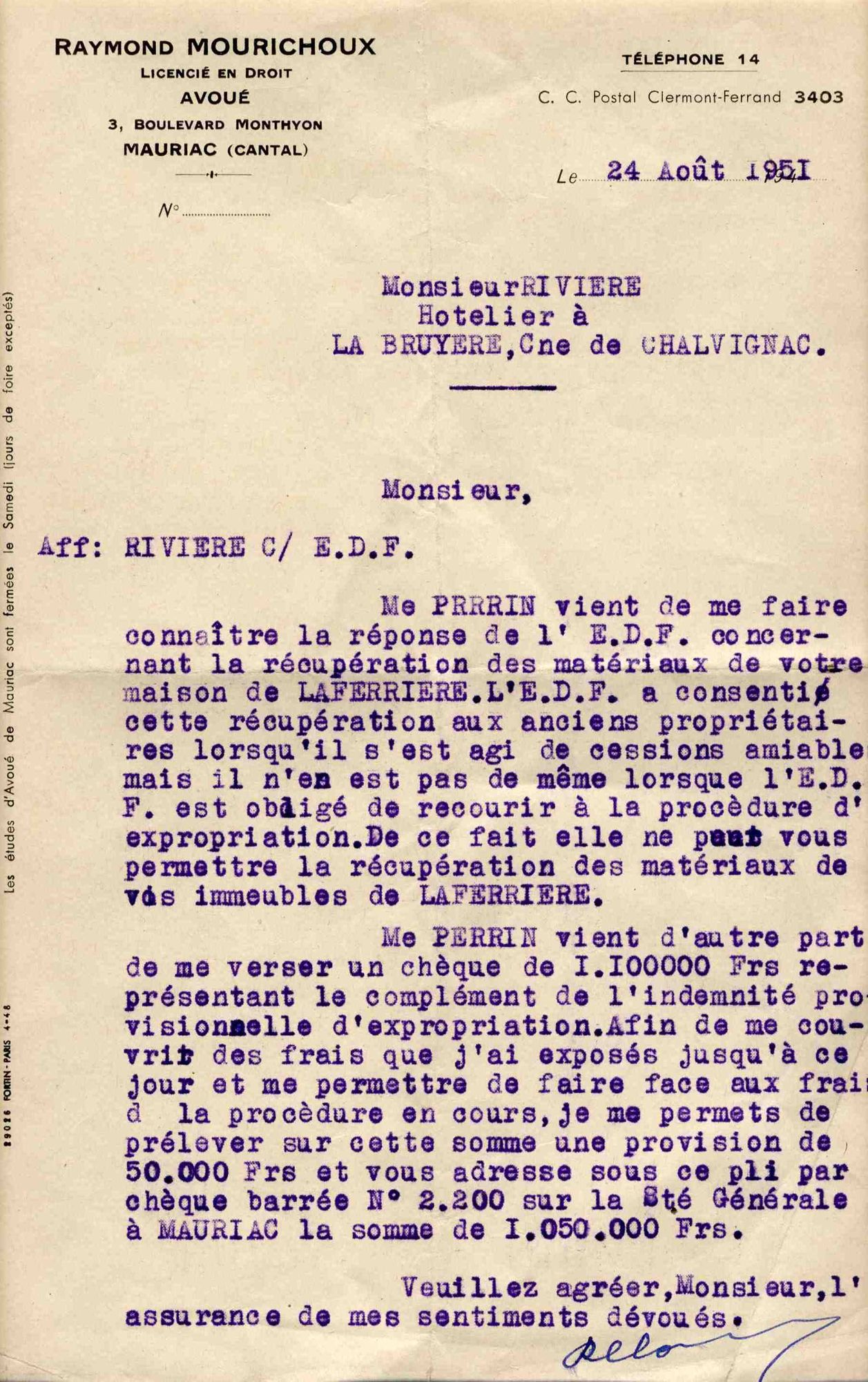 Les Rivière ont été expropriés : ils sont installés à Chalvignac, dans une maison appelée La Bruyère. La mise en eau n’a pas encore eu lieu, et ils voudraient récupérer des matériaux de leur maison. Leur avoué leur indique que c’est impossible : pas de « cession amiable », donc pas de « récupération des matériaux ». L’EDF, dans un geste plein d’élégance et apparemment en toute légalité, l’interdit à ceux qu’elle a été contrainte d’exproprier. Dura lex, sed lex !