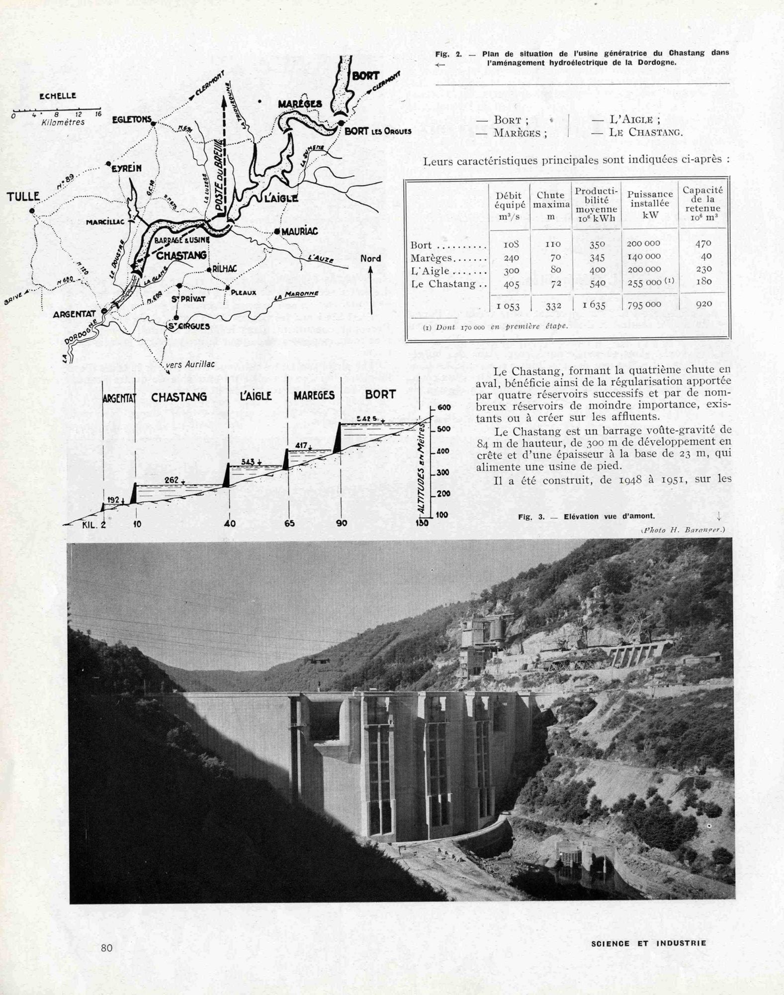 Le plan de situation et la coupe permettent de comprendre l’aménagement hydroélectrique de la Dordogne : Bort, Marèges (1936), l’Aigle (1945), Chastang (1951) et Argentat. Le Chastang est un barrage voûté-gravité. F. Auroy et B. Léo achèvent leur notice en jugeant que « l’ensemble a ainsi un aspect très simple et harmonieux »…