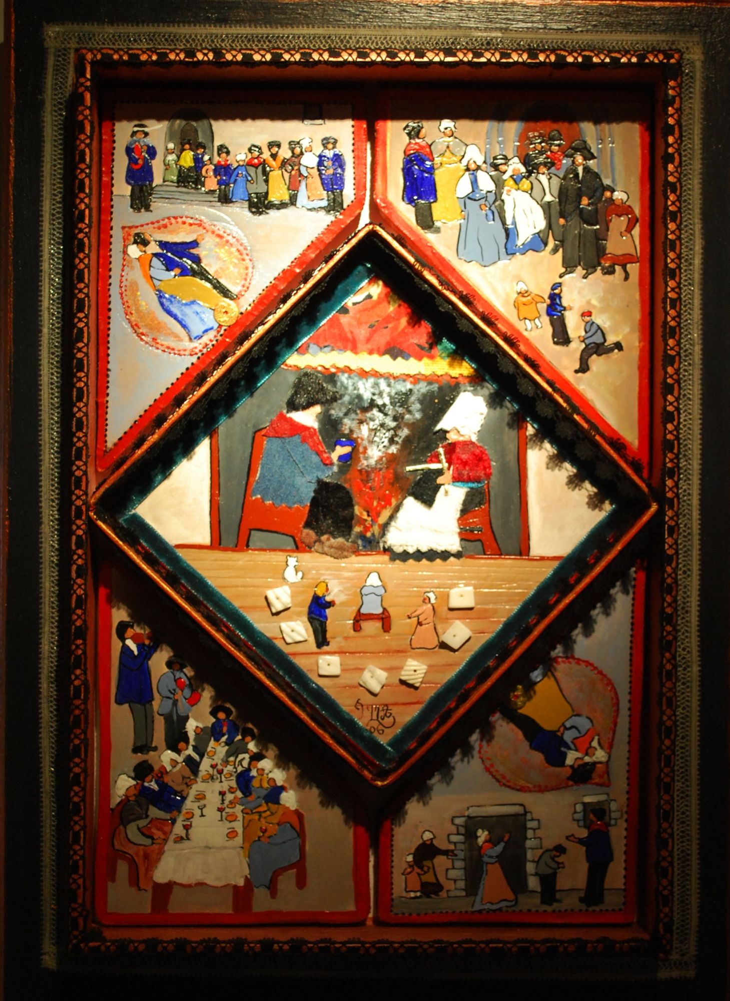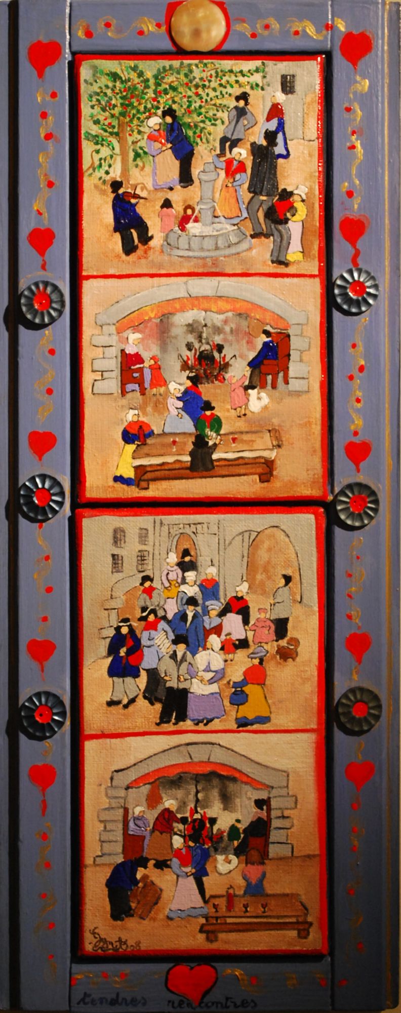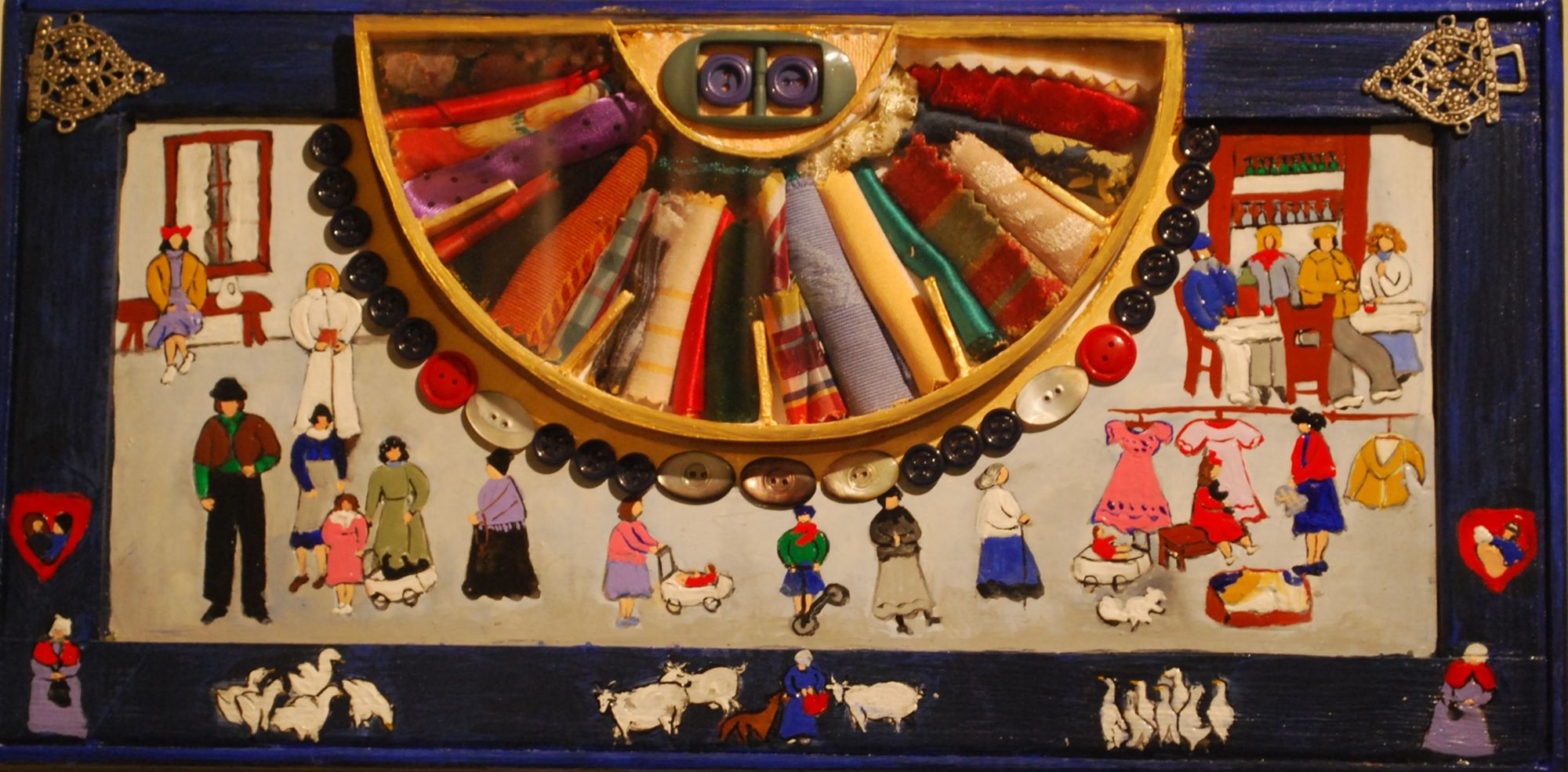 36 x 68 cm ; acrylique sur toile, argile, rubans, perles, boutons