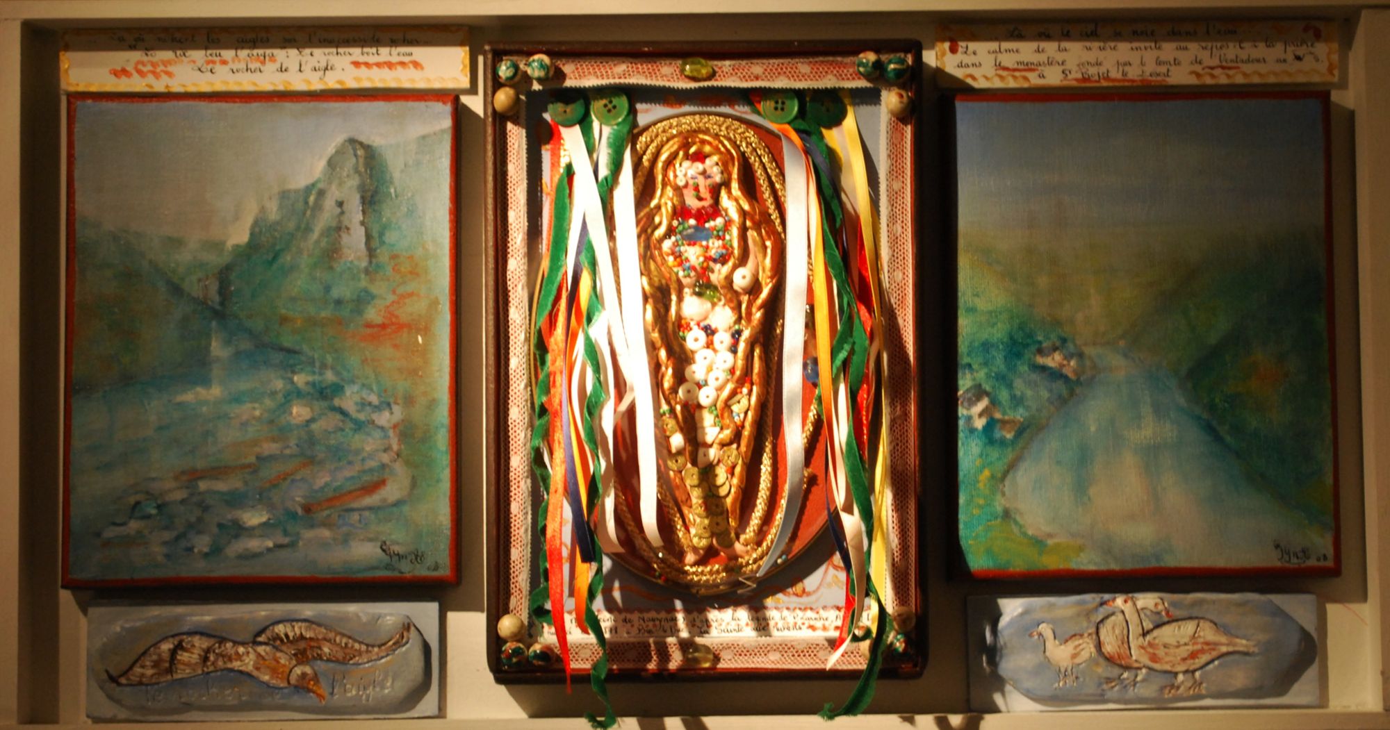 22 x 38 cm ; acrylique sur carton plume, boîtes, dentelles, cailloux