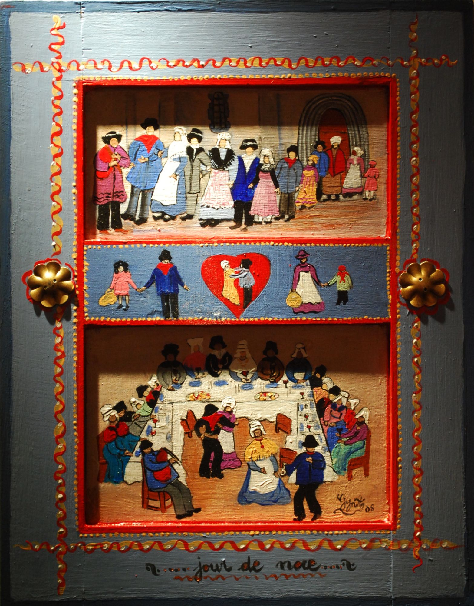 Les mariés et le cortège sortent de l’église au son de la cabrette, puis tous se retrouvent pour le banquet : les messieurs en chapeau, les dames avec leurs coiffes. Les mariés sont dans un de ces cœurs que l’on retrouve parfois, sculptés au linteau des maisons avec la date de la noce, entre les initiales des époux.