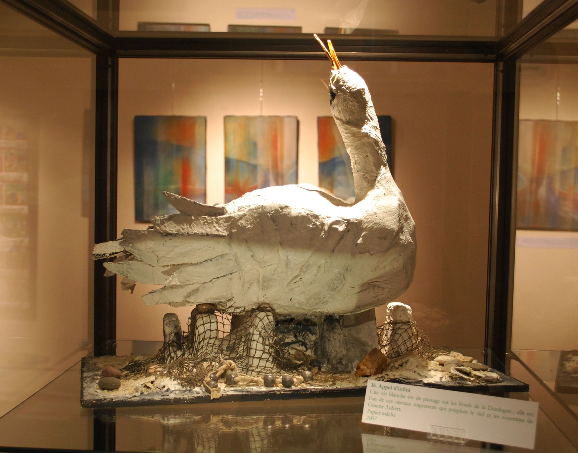 Les 30 œuvres (peintures et sculptures) de Ginette Aubert sont complétées par des souvenirs familiaux (lettres et photographies) ainsi que par des documents conservés aux Archives départementales (plan cadastral, dossier d’expropriation de la maison familiale de la Ferrière, livres sur les barrages).