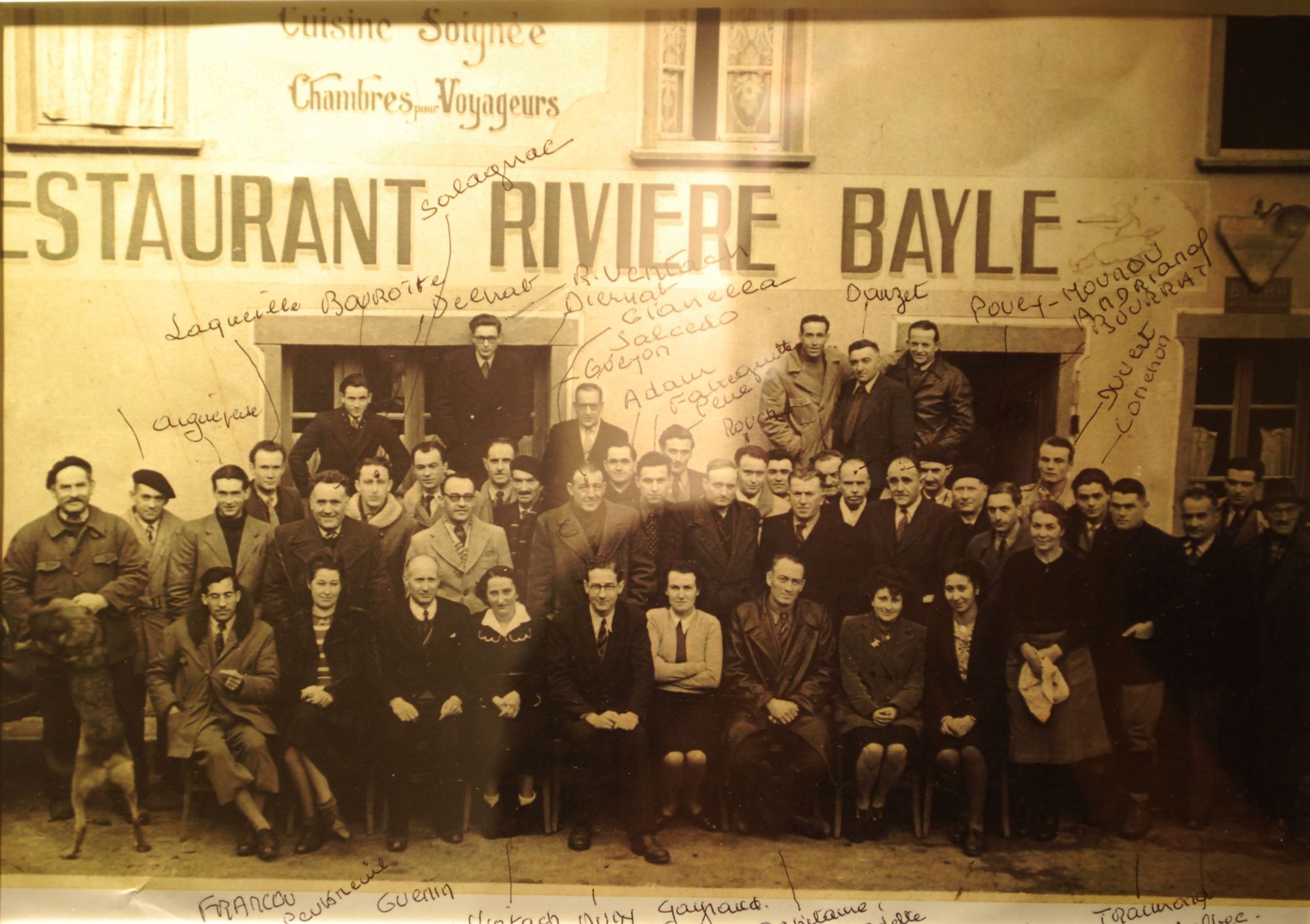 Plusieurs de ces cadres sont identifiés. Parfois le public est plus bigarré : « nous y avions une auberge prospère et des tonnelles, au bord de l’eau. J’y ai vécu mon enfance avec des réfugiés espagnols, roumains, italiens, tchèques. Ils travaillaient au barrage de l’Aigle ». L’auberge porte le nom des grands parents de Ginette Aubert, Paul-Hippolyte Rivière et Marie-Louise Bayle.