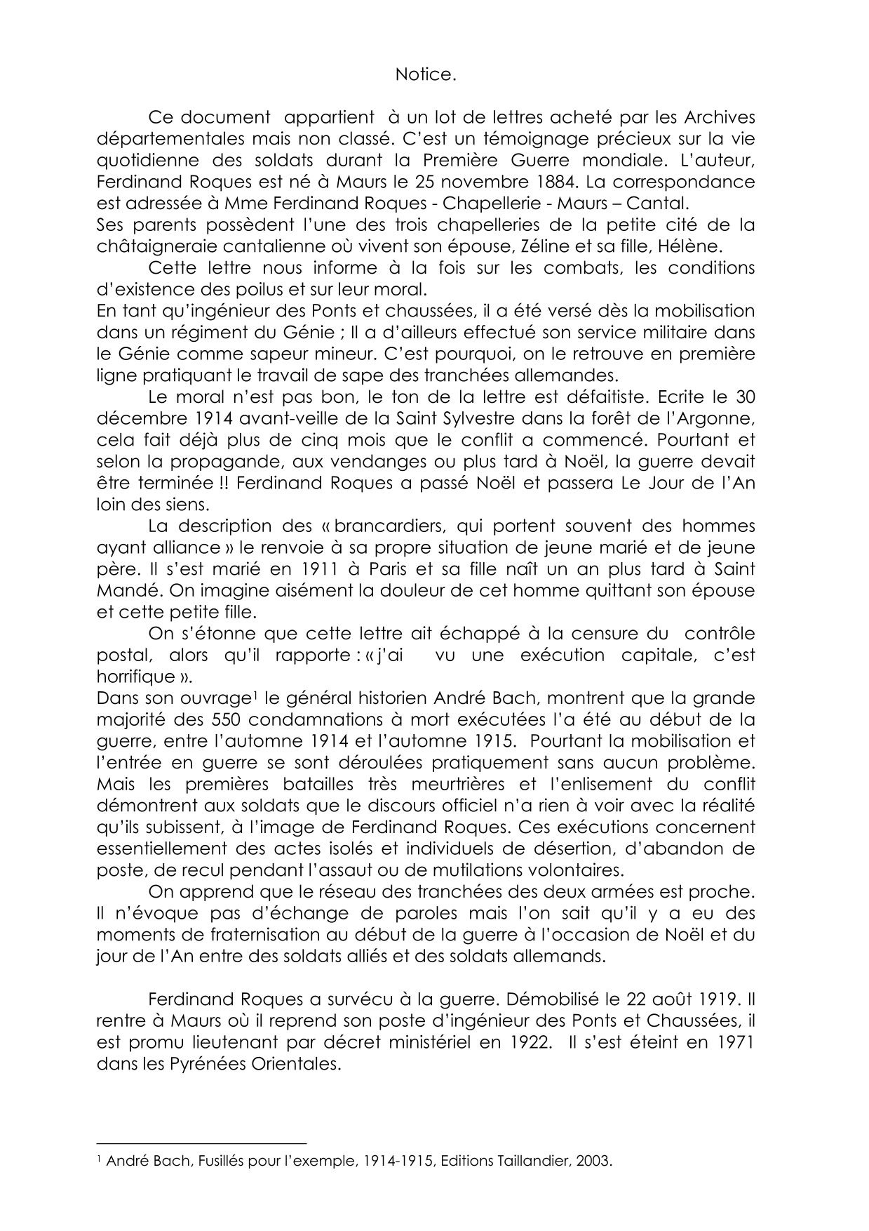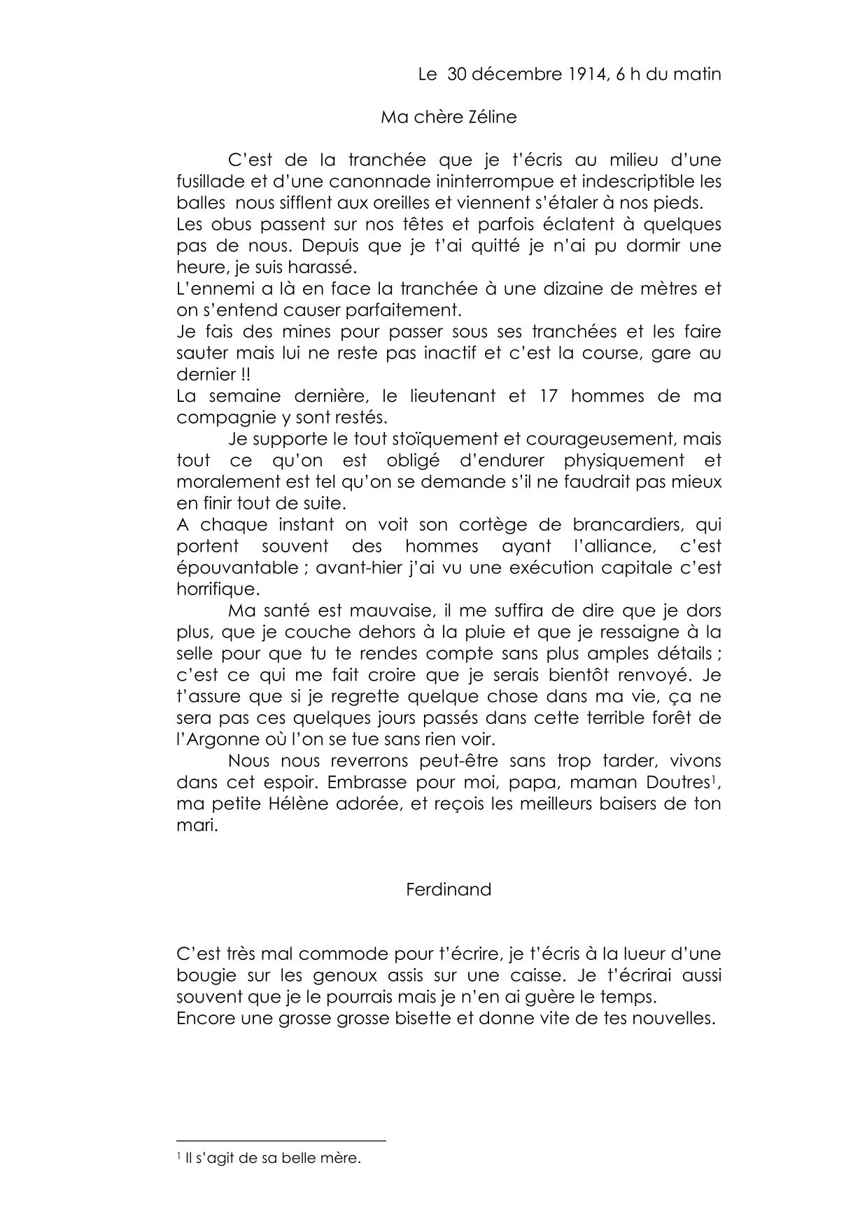 Ferdinand Roques a écrit durant toute la durée de la guerre à sa « Chère Zéline », qui l’attendait en Châtaigneraie, des dizaines de lettres. Dans cette correspondance, on décèle souvent la tristesse de ne pas recevoir suffisamment de nouvelles ; l’inquiétude que les lettres de sa femme ne le suivent pas. La guerre est présente dans les rapides descriptions qu’il fait de son quotidien (vie dans les tranchées ou au repos). Lorsqu’il évoque « les Boches », c’est toujours sur le ton de l’ironie et en minimisant les combats. À cela deux raisons principales : ne pas inquiéter son épouse et ne pas subir la censure du contrôle postal. La lettre est datée du mois de février 1914, acte manqué bien sûr.