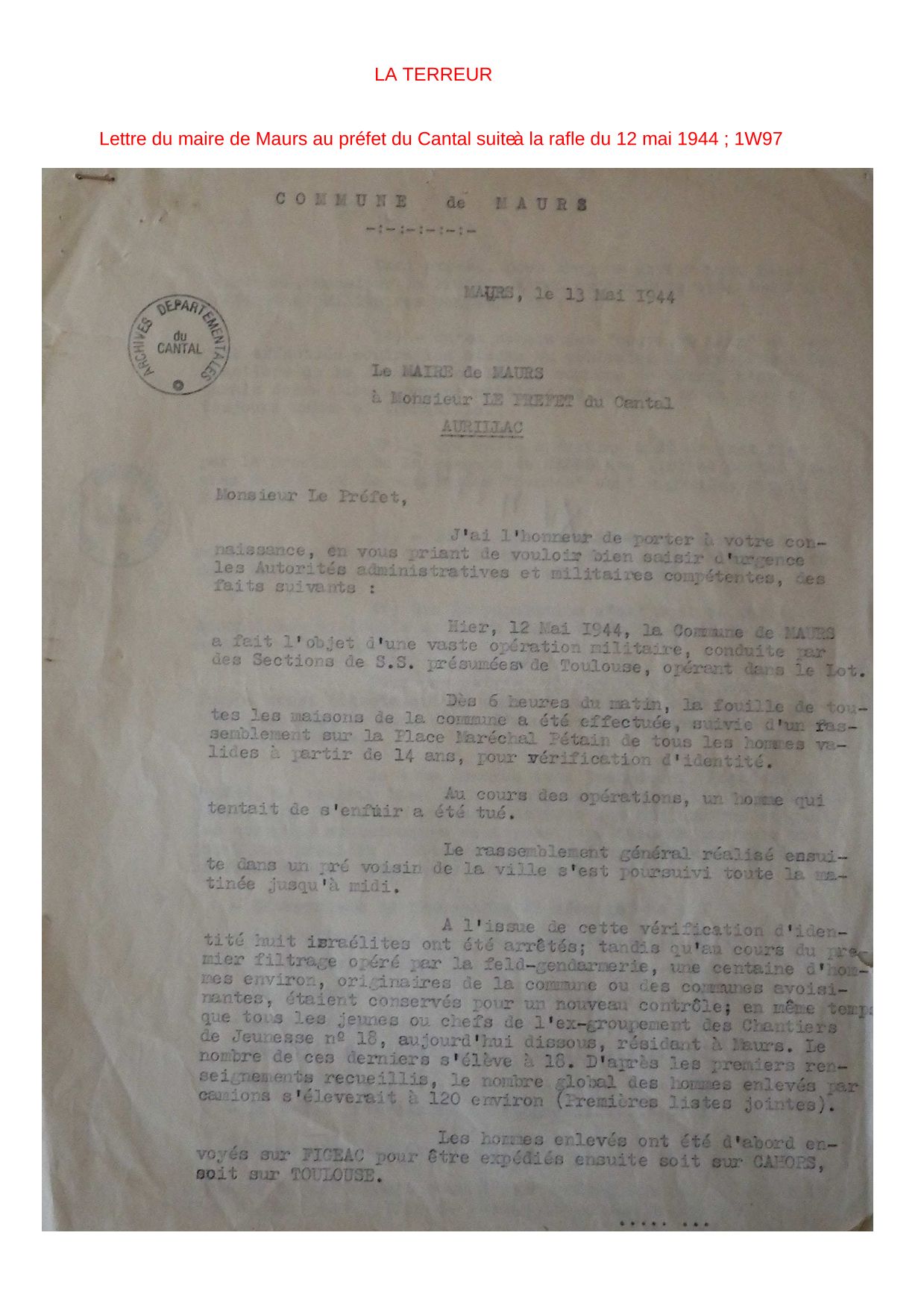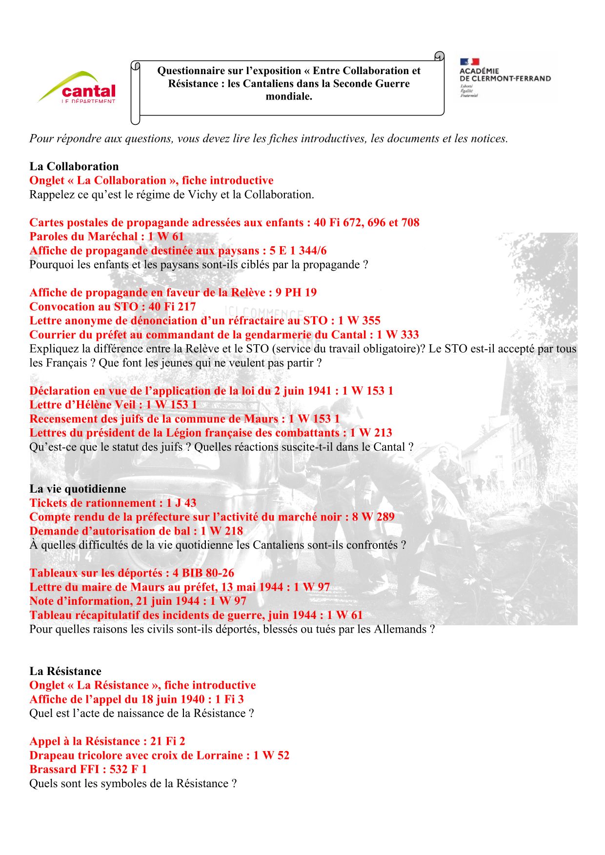 Il s’agit d’un travail à partir des ressources locales abordant la politique de la Terreur, la propagande/collaboration, la vie quotidienne et la résistance dans le Cantal.