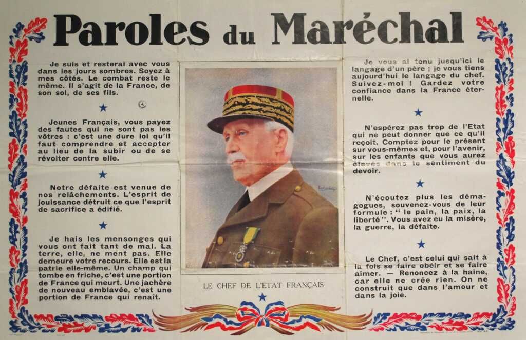 On y retrouve la nouvelle devise du régime de Vichy «Travail, Famille, Patrie ». Devise écrite sur fond du drapeau tricolore, qui encadre également ce dessin, rappelant ainsi le nationalisme profond de ce régime autoritaire et traditionnaliste. Des mots à la gloire du Maréchal Pétain y sont également inscrits. Ceci rappelle le culte de la personnalité de mise au cours de cette période.