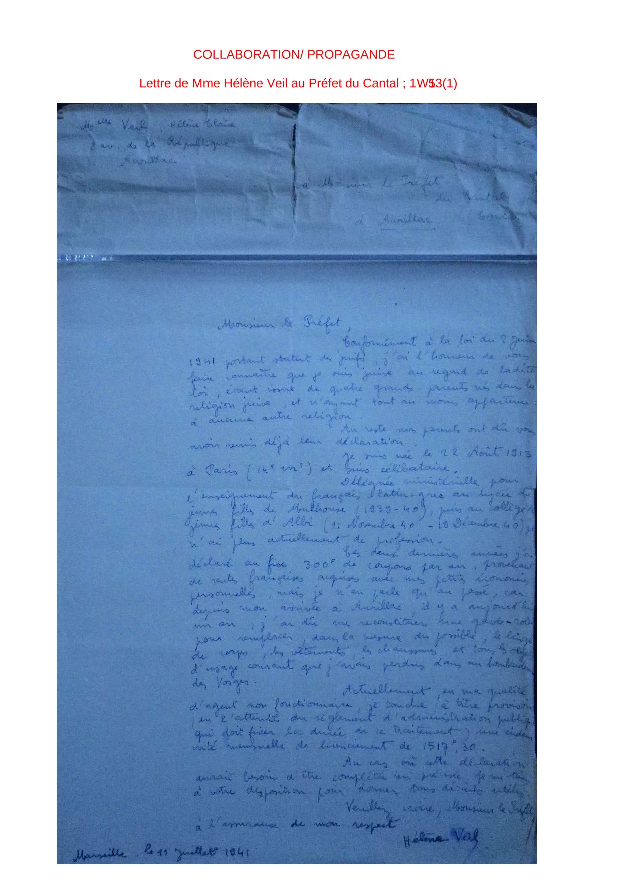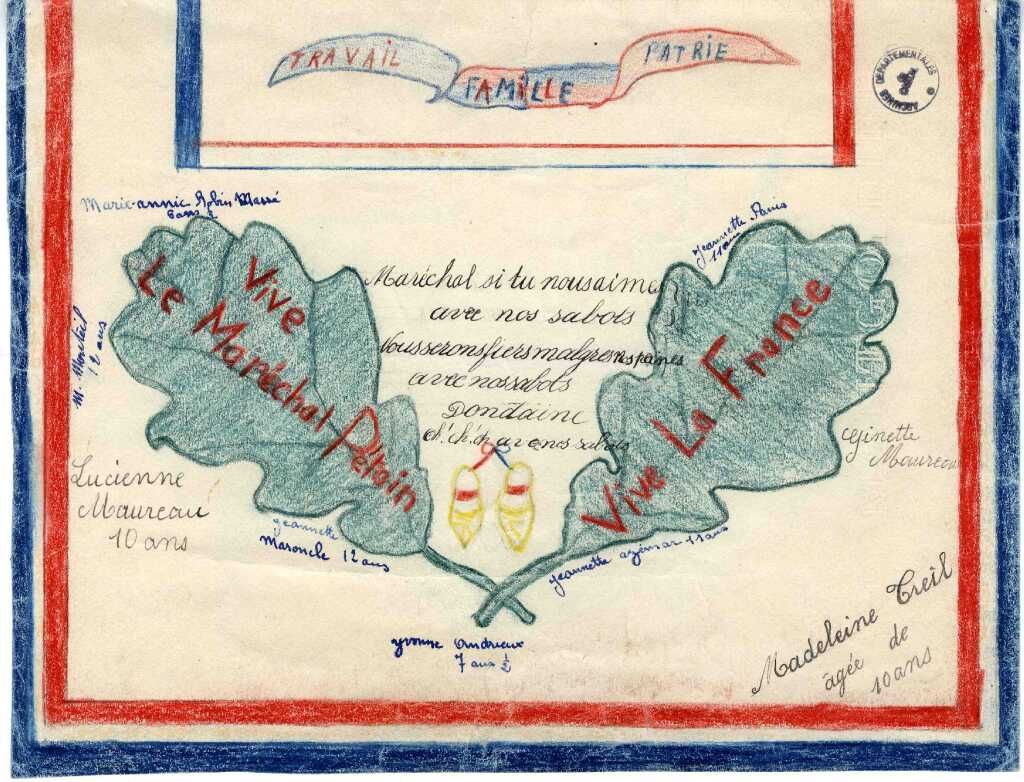 Ce dessin (1W 61) réalisé par Madeleine Treil et signé par plusieurs enfants de tous âges de l'école de Viescamp sous Jallès (vers Lacapelle Viescamp) du début des années 1940, peut venir illustrer le chapitre 2 Effondrement et refondation républicaine (1940-1946) de la partie 3 Vie politique et société en France sur Vichy du programme de 3ème.