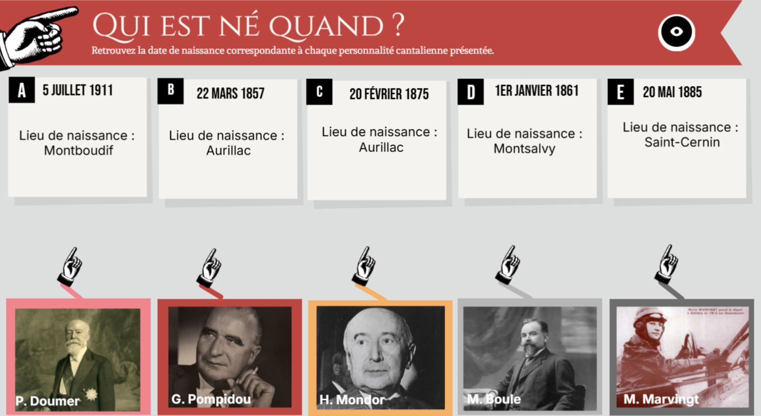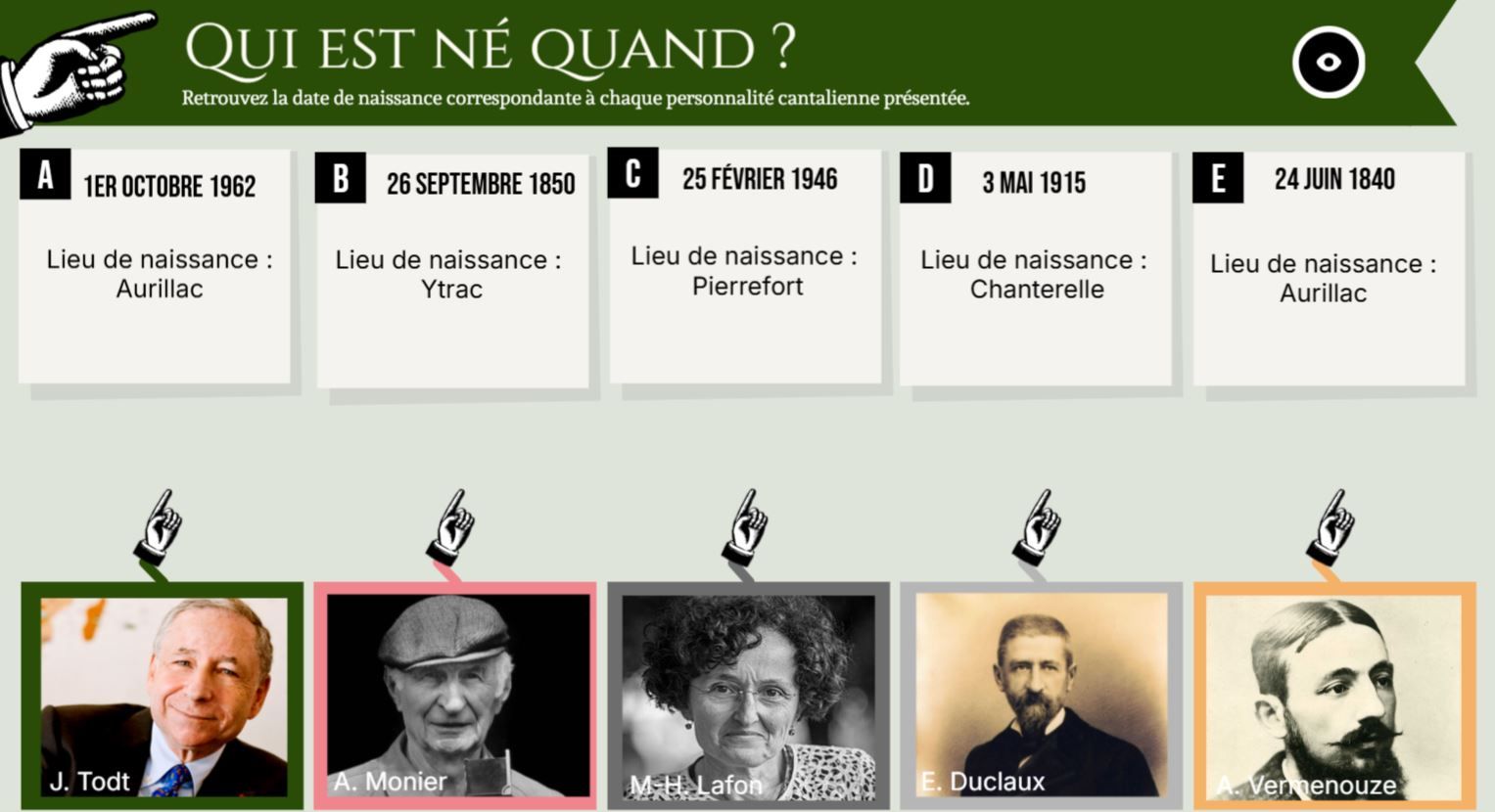 Associez chaque cantalien à ses dates et lieu de naissance.