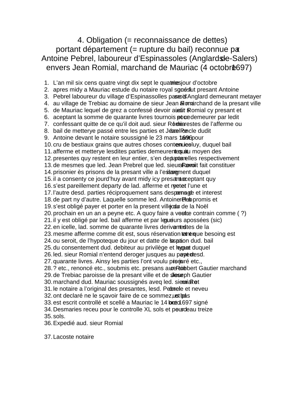 Obligation (= reconnaissance de dettes) portant département (= rupture du bail) reconnue par Antoine Pebrel, laboureur d'Espinassoles (Anglards-de-Salers) envers Jean Romial marchand de Mauriac (1697) Transcription (8.4 Ko)