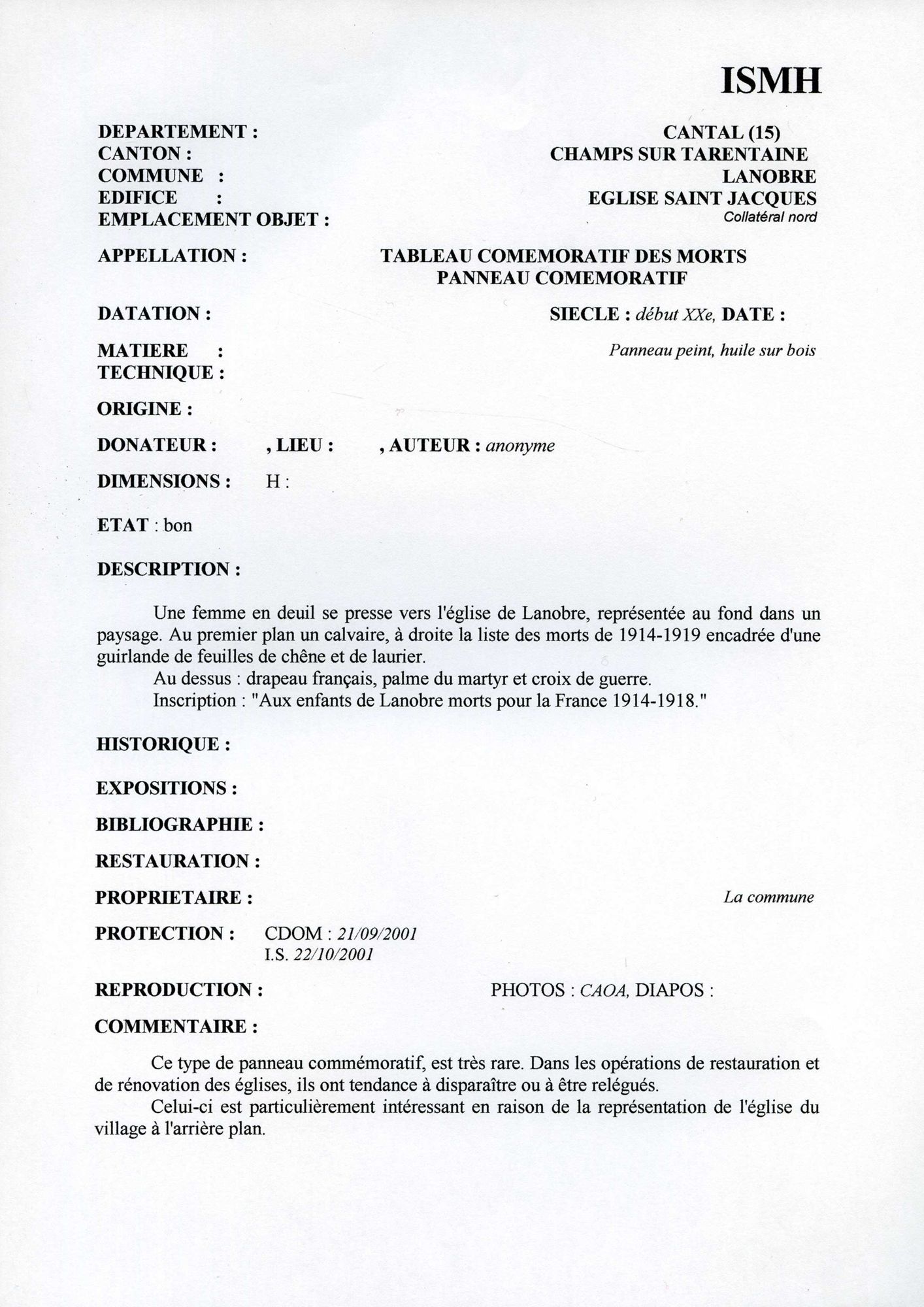 Tableau commémoratif des morts, panneau peint, huile sur bois, inscription : "Aux enfants de Lanobre morts pour la France 1914-1918"