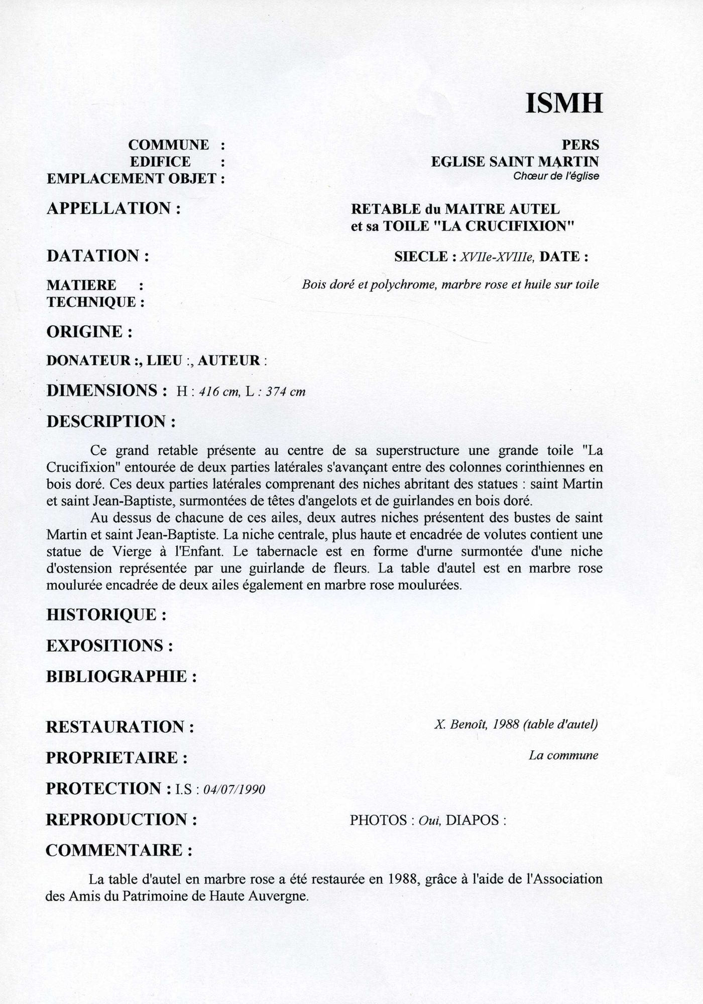 Retable du maître-autel, bois sculpté doré, polychrome, marbre rose, et "La Crucifixion" huile sur toile.
